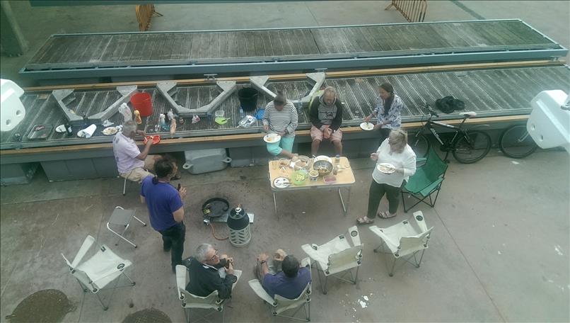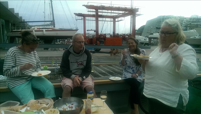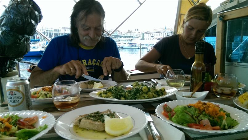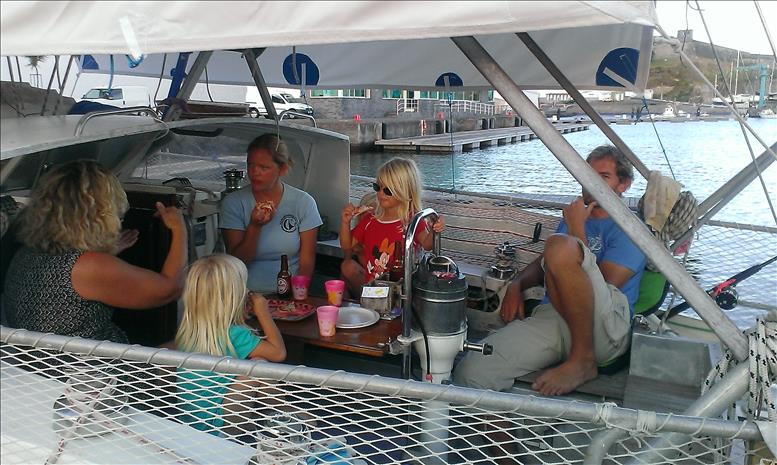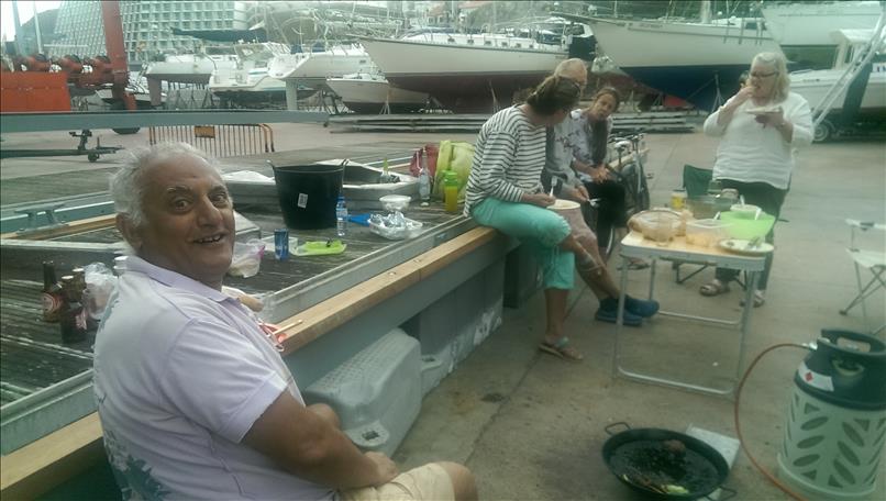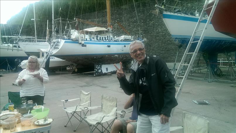 Damit’s nicht nur um Katastrophen geht: kurz vor dem Morgen ist die Nacht am finstersten! Auch der Regen macht manchmal Pause und wir feiern das mit Grillabenden in der Werft. Die Britin Barbara mit ihrer schwimmenden Katastrophe “Turtle”, deren weiblicher südafrikanischer Bootsmann Nicoletta, die Holländer Birgit und Daniel von der schönen “Synergie”, der (später leider mit Wirbelbruch im Spital gelandete) türkisch-britische Hikmet mit seinem lieben Hund Mischa und seinem betagten Boot “Taka Tuka”, Alain aus Kanada mit seiner antiseptischen “Solaise” und auch Andere machen gemeinsam mit uns das Beste draus.