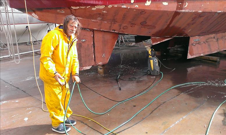 Irgendwann glänzt “Voodoochile” aber wieder wie neu, alle grauslichen Roststreifen sind entfernt, Auspuffe wieder mal geschweißt, Sprayhood geflickt und neues Giftzeug auf den Unterbauch geschmiert. Uli putzt, flickt, malt und versucht täglich, die elenden Vögel mit dem Gartenschlauch zu vertreiben. Ohne jeglichen Erfolg.
