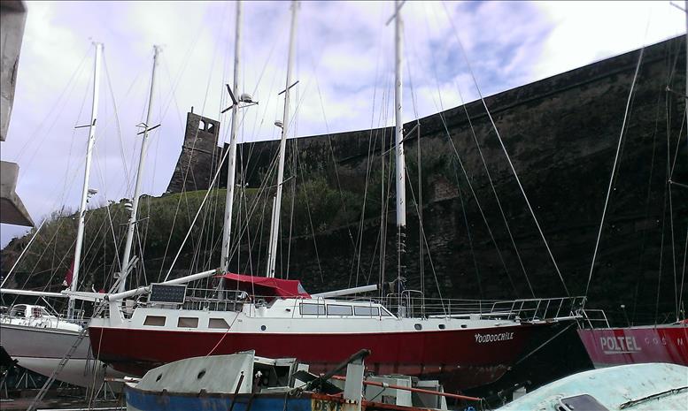 Wie immer werden wir rundum freundlich begrüßt, aber der erste Anblick unseres stolzen Schiffchens ist durchaus ernüchternd: rostige Püttings aufgrund der extremen Luftfeuchtigkeit, viel Vogeldreck wegen der unzähligen Flieger, die in der nahen hohen Festungsmauer nisten, und auch sonst etwas trostloses Ambiente. What shall’s! Wir kaufen neue Overalls, schleifen das halbe Boot ab und streichen die teuren Zweikomponenten-Lacke manchmal doppelt, wenn es uns in den ersten mühsam erkämpften Anstrich reingeregnet hat.