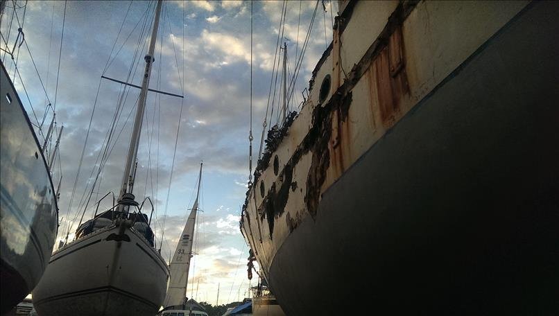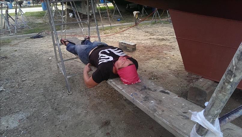 Ich liege unterm Boot, schweißtriefend und dreckig, schleife altes Antifouling mit der Flex ab, daneben ein Brite unter seinem Fahrzeug bei derselben Arbeit: